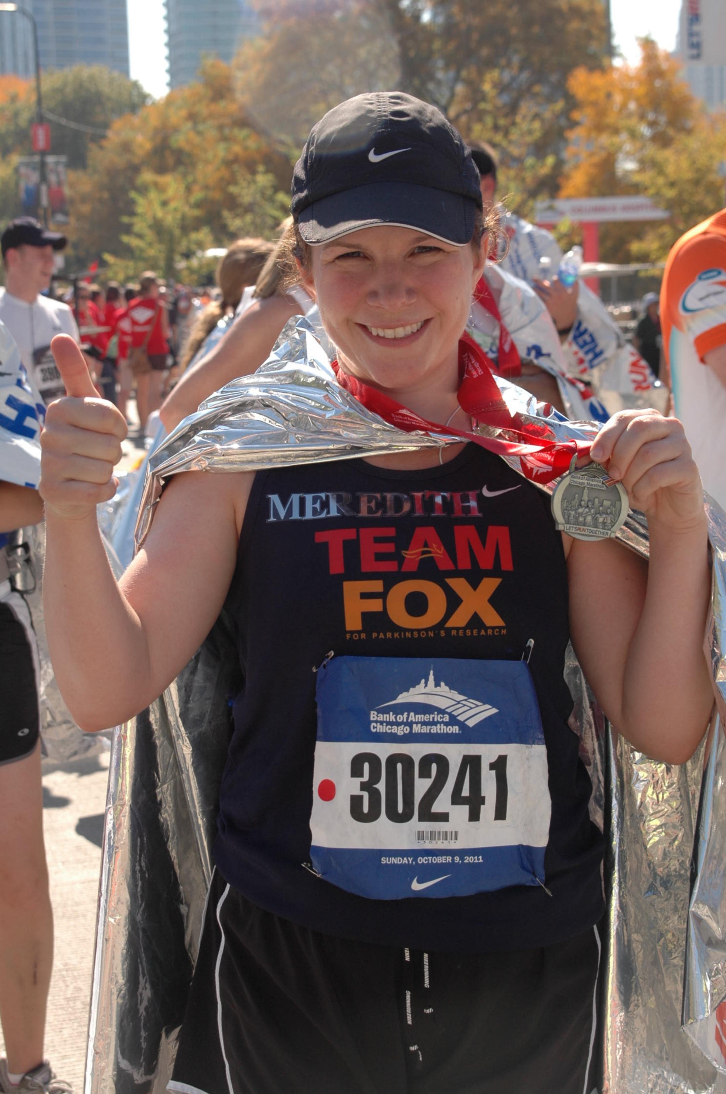 As I approached the final mile, the extra energy from the crowd propelled me up the final toward the finish line as fast as I could hope to move. As I crossed, I managed to smile for the cameras, victorious. I got my medal and my funny metal blanket and posed for the Mere-a-thoner picture that’s attached.